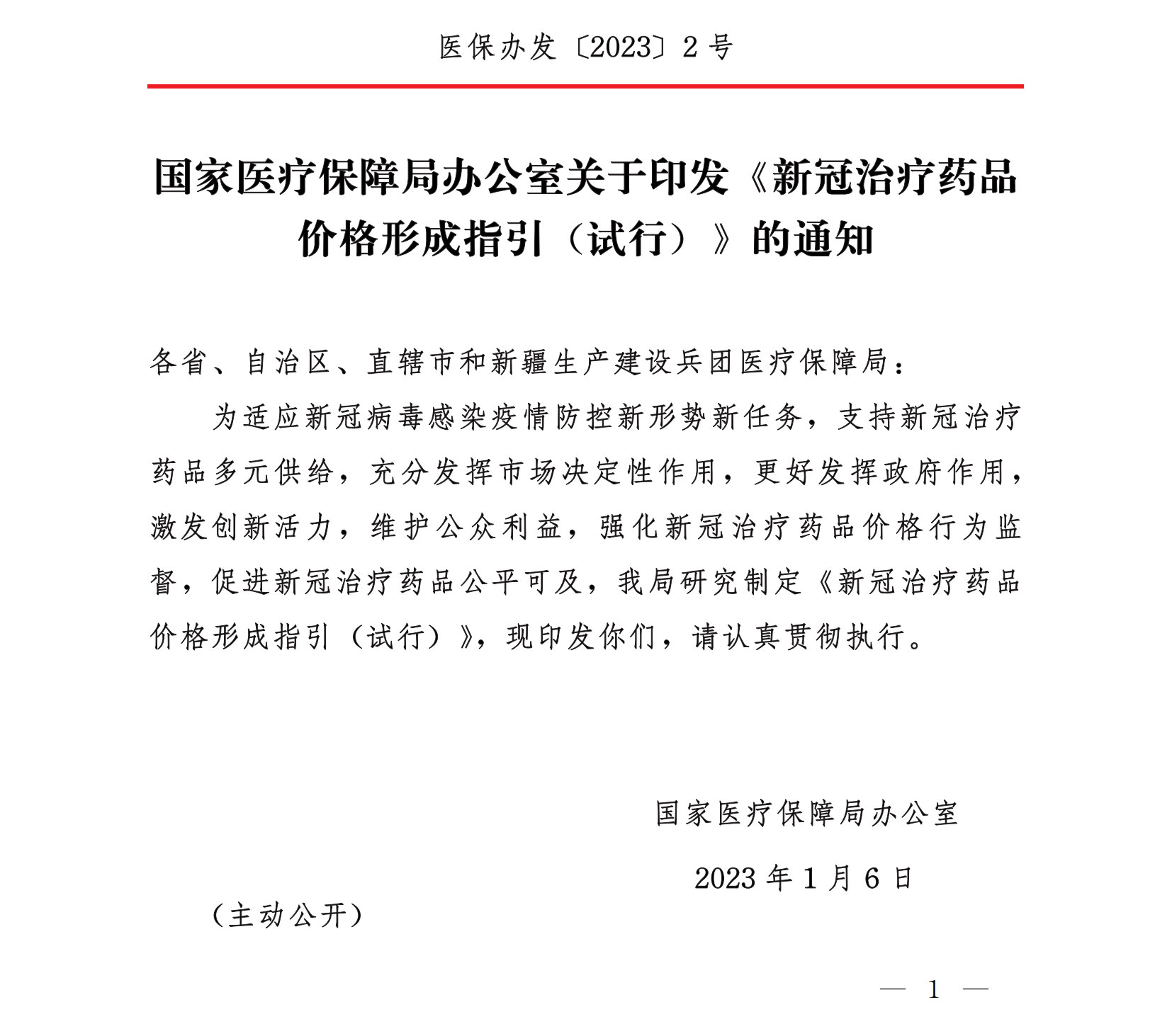 国家医疗保障局办公室关于印发《新冠治疗药品价格形成指引(试行)》的通知